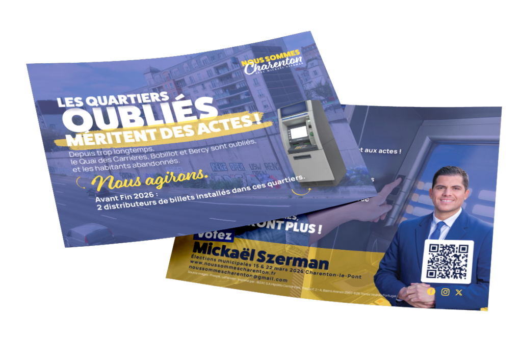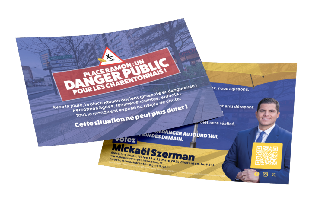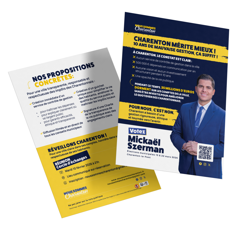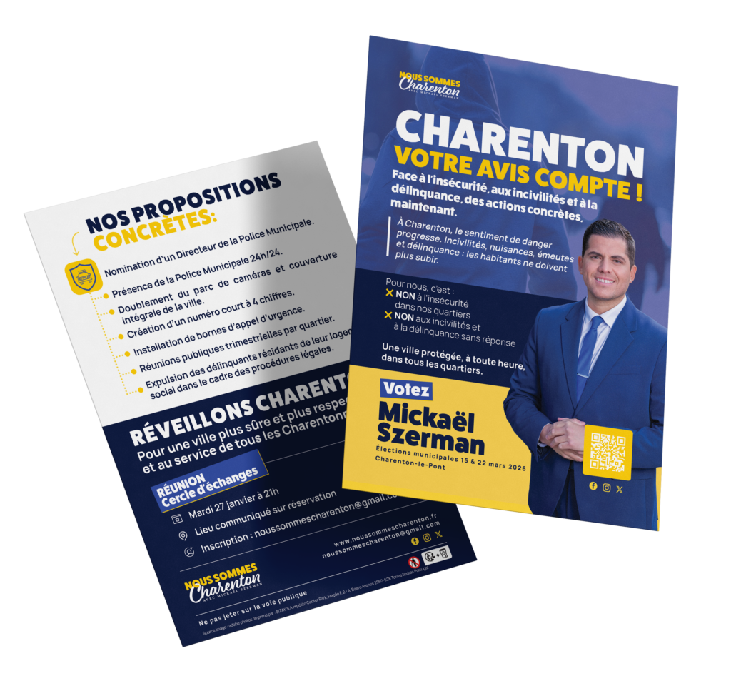 propectus campagne nous sommes charentons sur la securité des quartiers avec mickael szerman sur la droite et un fon bleu blanc et jaune